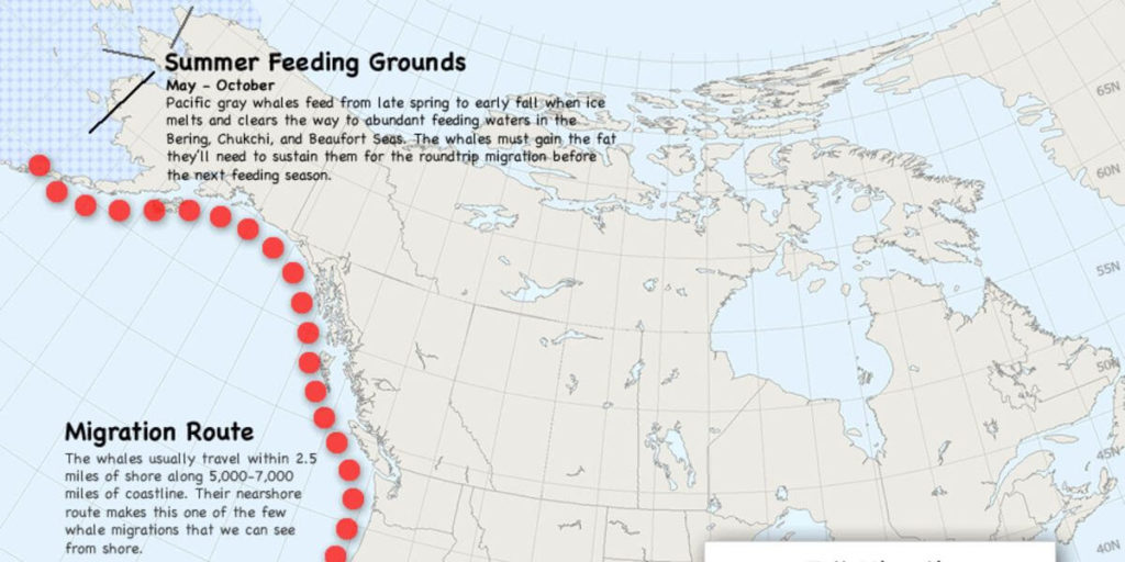 Gray Whales (Eschrichtius robustus) have the longest known migration of any mammal on the planet. They spend their winters mating and giving birth to young in the warm waters of the Baja peninsula and summers feeding in the Bering, Chuckchi, and Beaufort Seas of the Arctic. Most whales travel at least 10,000 miles round trip, although some do not travel the entire migration route and stay feeding further south during the summer. Along this migration, many whales can be seen along the West Coast, because they only travel within 3 miles of the shore.